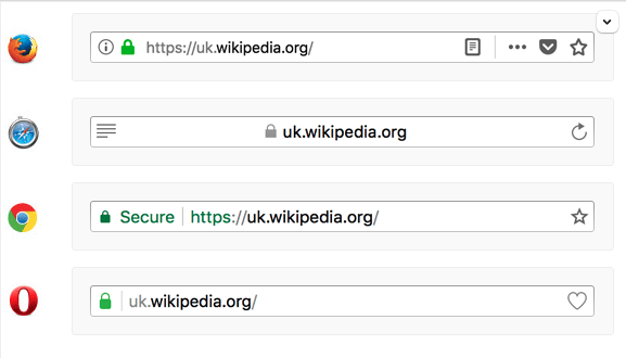 Identifying a secured website is simple — look for a padlock icon displayed next to the URL in the address bar. The appearance may vary depending on the browser you are using: